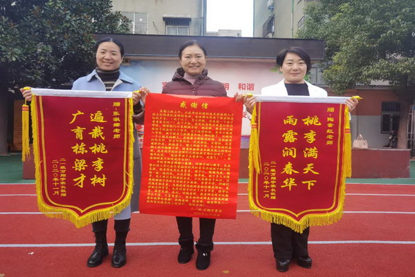 據了解,一天大課間,一個男生因不舒服突然嘔吐,課桌上、地上、書包上、鄰桌腳上和自己身上,都是嘔吐物,兩位老師馬上跑過去詢問情況,第一時間給家長取得聯系后,及時清理嘔吐物,家長來后,一切清理完畢,給家長一個干干凈凈的孩子,家長很是感激,特意把繡有“遍栽桃李樹  廣育棟梁才”、“桃李滿天下 雨露潤春華”的錦旗和感謝信送給兩位老師,一股暖意和家校情誼無以言表。面對家長的感激,兩位老師說:“這只是我們的工作本分而已......”。簡單的一句話是外國語小學所有教師真實的寫照。