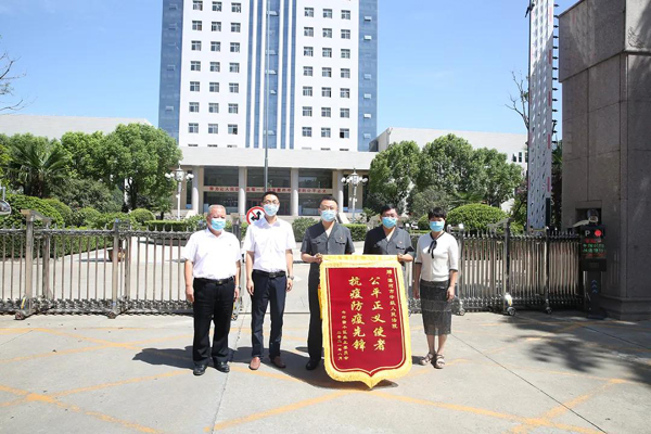 8月25日上午,順河街建西社區黨支部書記、居委會主任梁三閣、牛行街小區業委會主任時勝濤將印有“公平正義使者,抗疫防疫先鋒”的錦旗送到市法院,代表社區工作人員和社區居民對市法院在社區疫情防控工作中給予的大力支持表示感謝。