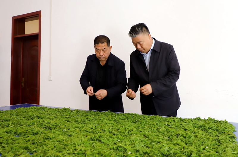 舞陽縣水利局駐九街鎮(zhèn)橋張村第一書記龐樹仁(圖右)和橋張村村支部書記張軍輝(圖中)探討炒茶工藝