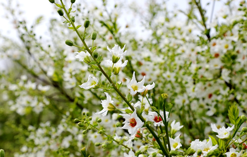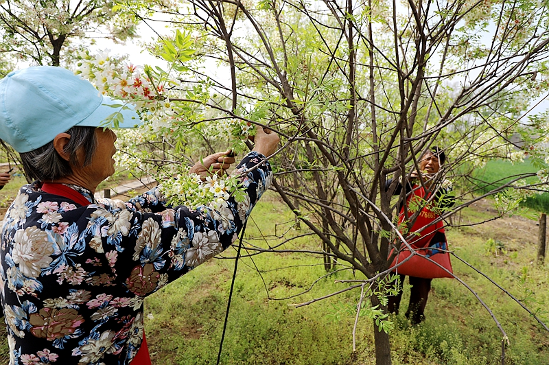 “橋張村以前是個(gè)古寨,這一渠清水是古寨外面的寨河,文冠果的種植基地就在寨河兩岸,7000多株文冠果為橋張村戴上了‘花環(huán)’。文冠樹上結(jié)的文冠果又叫龍果、龍瓜,可以榨油,葉子能泡茶,花中含有芩皮苷,有解熱、安眠的作用,不論是食用、藥用還是觀賞價(jià)值都很高,可以說全身都是寶。用文冠果葉子炒出的茶葉,口感香醇,市場價(jià)可賣到每公斤1000元以上。”4月7日,在舞陽縣九街鎮(zhèn)橋張村文冠果種植基地,該村村支部書記張軍輝介紹。
