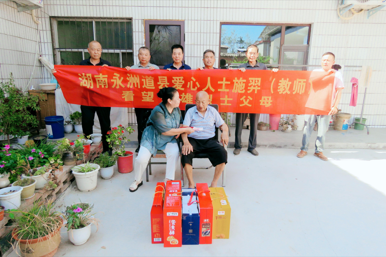 在八一建軍節即將來臨之際,7月29日下午,湖南省永州市道縣退休女教師、愛心人士施羿,為全國一級“戰斗英雄”李海欣烈士的父親李銀秀贈送了2000元的慰問金,祝英雄的父親八一建軍節快樂!身體健康!家庭幸福!