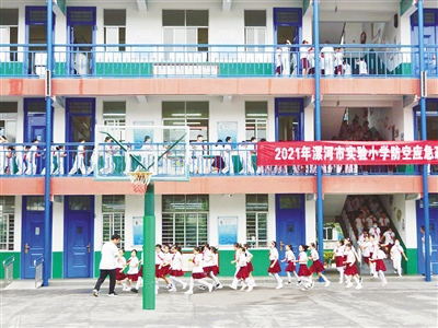 9月18日上午,郾城區人防辦組織開展防空演練及宣傳活動。圖為市實驗小學的學生在老師帶領下,以最快的速度從教室撤離到操場。見習記者 王嘉明 攝