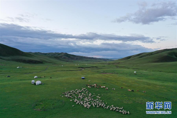 牧群和蒙古包分布在阿魯科爾沁草原上(6月3日攝,無人機照片)。