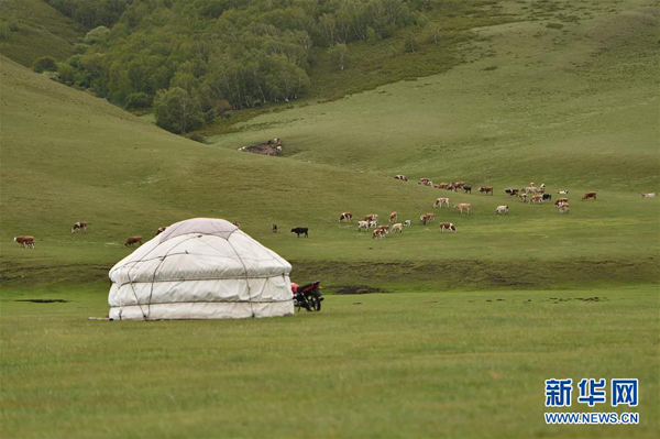 近日,內蒙古自治區赤峰市的阿魯科爾沁草原開始返青。牧群和潔白的蒙古包散落在嫩綠的草原上,景色宜人。 新華社記者 劉磊 攝