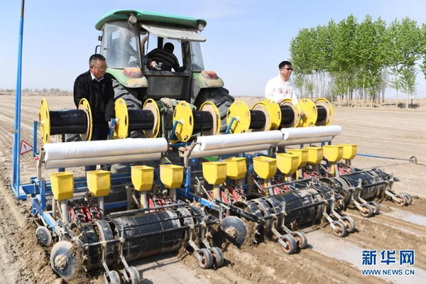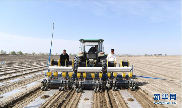 中國農業科學院棉花研究所生物技術研究室主任袁有祿(左)、國家棉花產業聯盟副理事長王進華在喀什地區莎車縣指導播種(4月11日攝)。