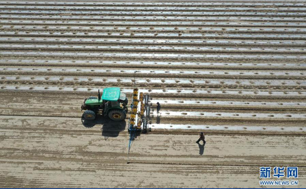 棉農在喀什地區莎車縣播種“中棉所127”品種棉花(4月11日攝,無人機照片)。