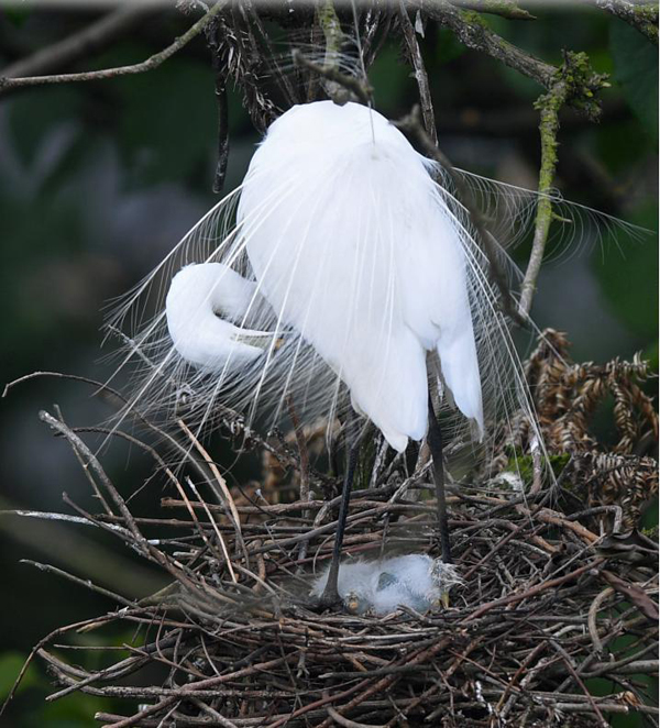 在南昌市新建區象山森林公園內,白鷺守護著雛鳥(5月18日攝)。