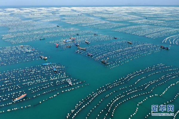 5月29日,浙江省舟山市嵊泗縣枸杞島的漁民駕著小船在貽貝養殖基地培育貽貝(無人機照片)。