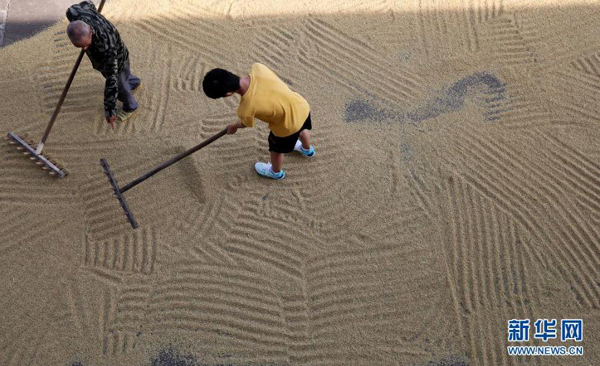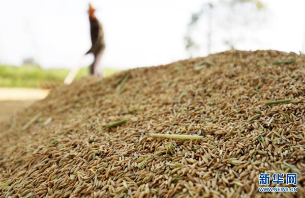 立秋過后,湖南省資興市種植的中稻陸續(xù)成熟,農(nóng)民搶抓農(nóng)時(shí)收割、晾曬稻谷,呈現(xiàn)一派忙碌景象。