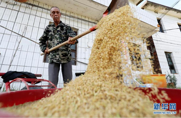 湖南資興:中稻成熟農(nóng)民忙收獲