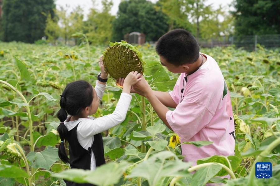10月13日,在重慶市北碚區一個農民創業園,小朋友在工作人員指導下體驗采摘向日葵。
