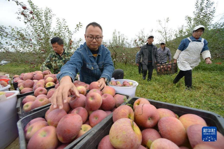 10月21日,在貴州省威寧彝族回族苗族自治縣牛棚鎮龍山種植專業合作社的蘋果園,曹杰(右二)和父親曹宣明(左二)將剛采摘的糖心蘋果裝筐。新華社發(韓賢普 攝)