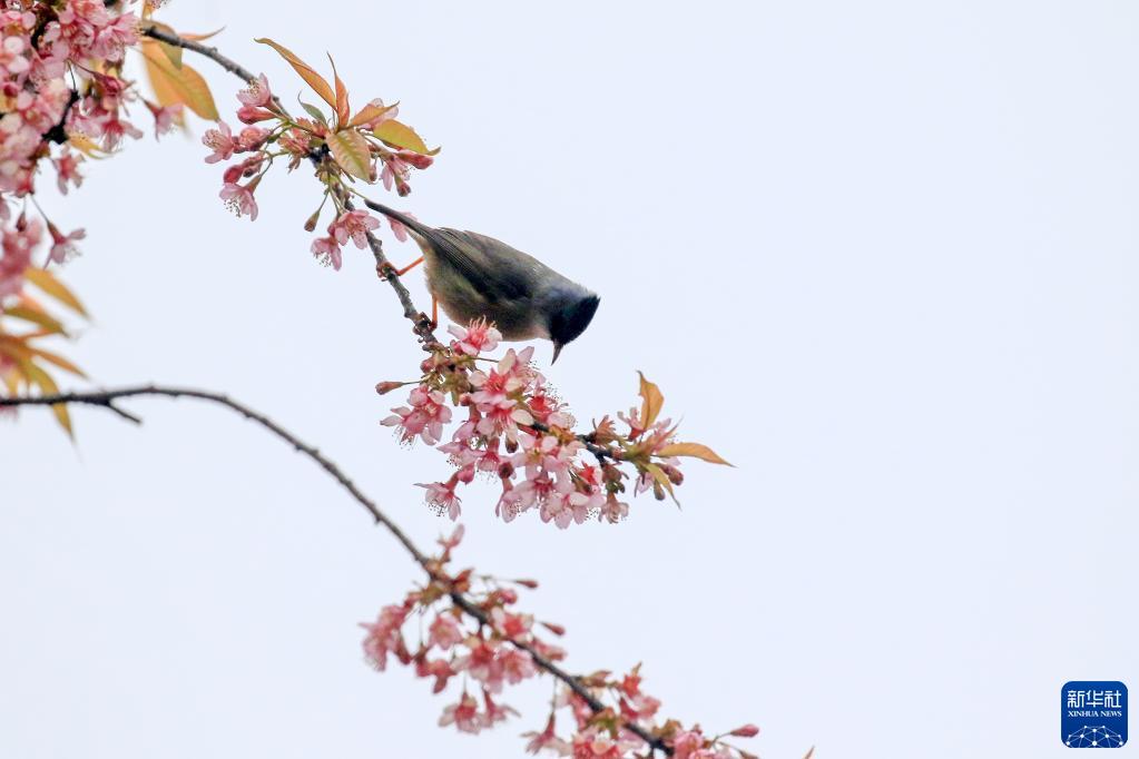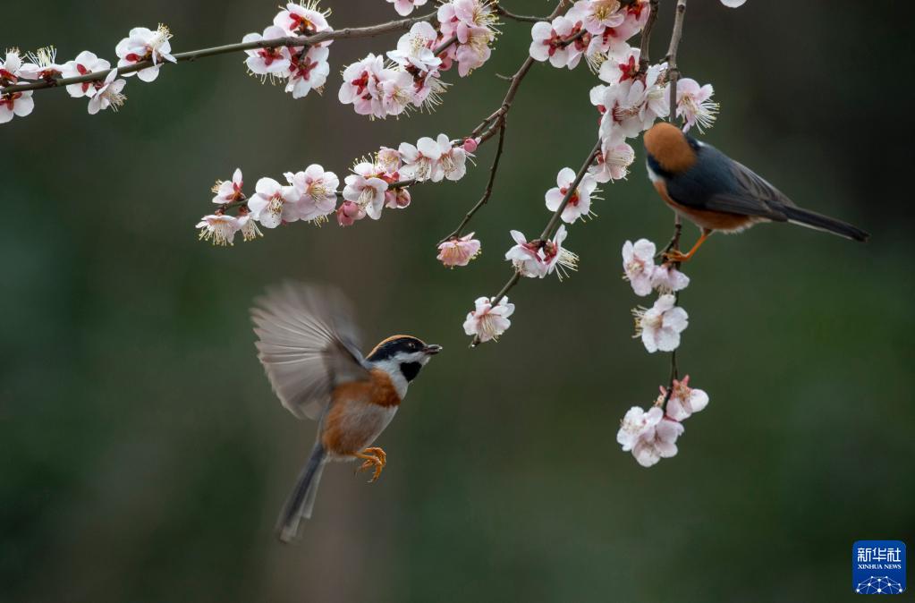2月4日,在江蘇省無錫市管社山莊,小鳥在花間嬉戲。