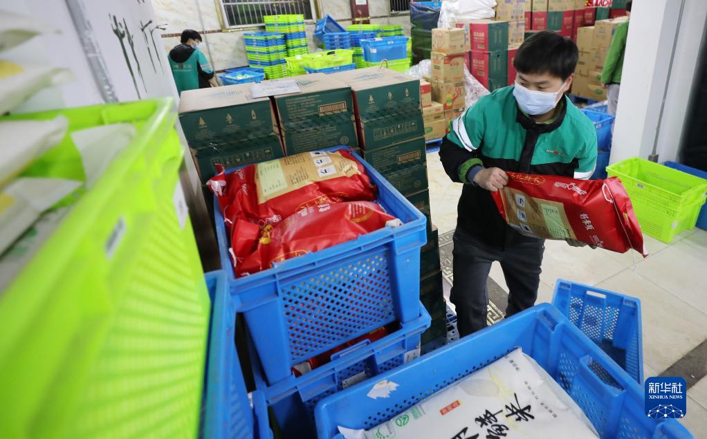 3月16日,在位于上海閔行區(qū)吳中路的一家網絡購物平臺倉配站點外,配送騎手提著包裝好的網絡訂單貨品走出站點。