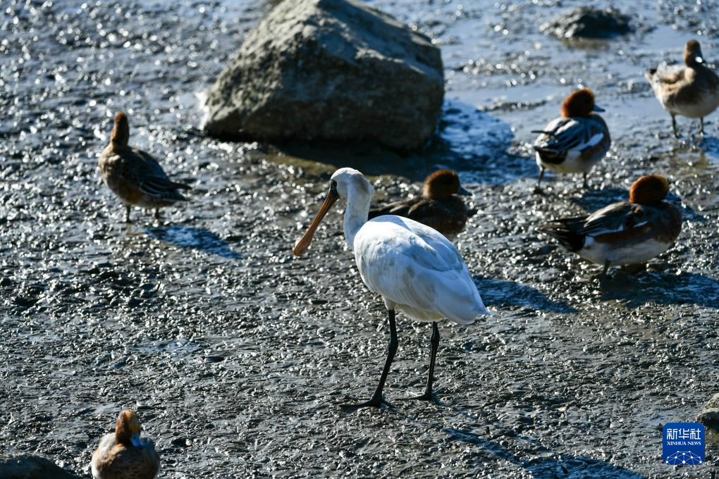 11月29日,在深圳紅樹林海濱生態公園,黑臉琵鷺等候鳥在覓食休息。