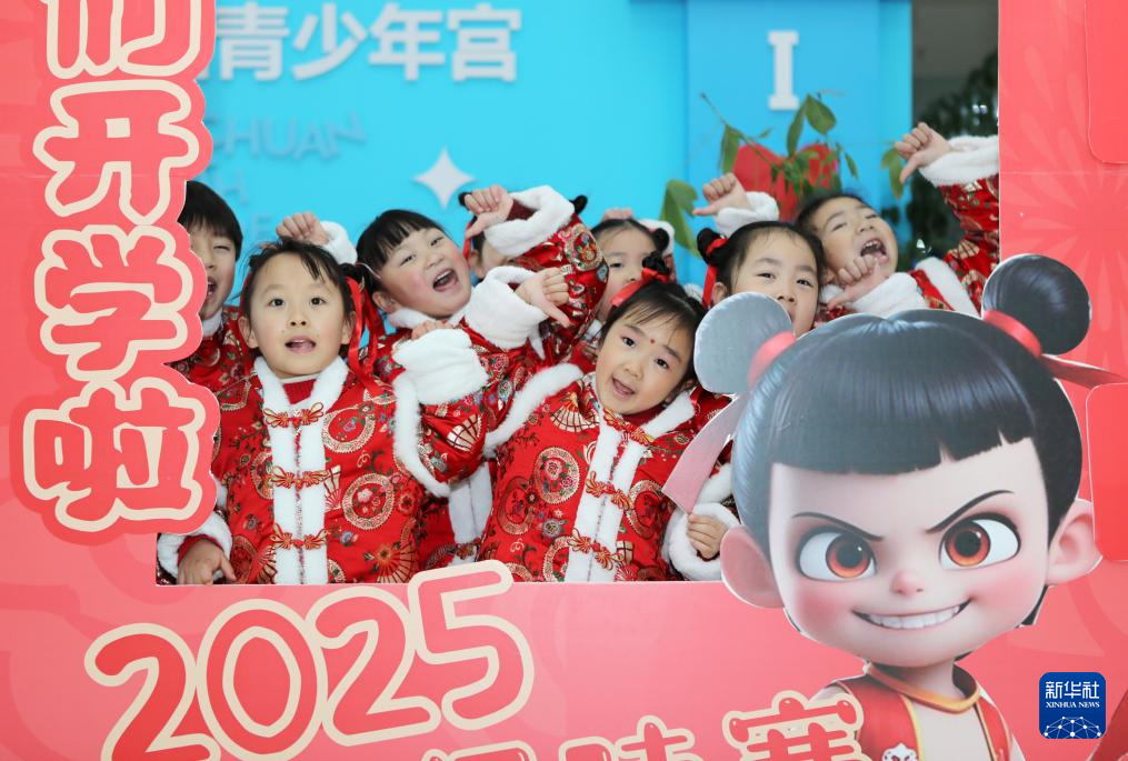 2月23日,在重慶市永川區青少年活動中心,孩子們與哪吒卡通形象合影。