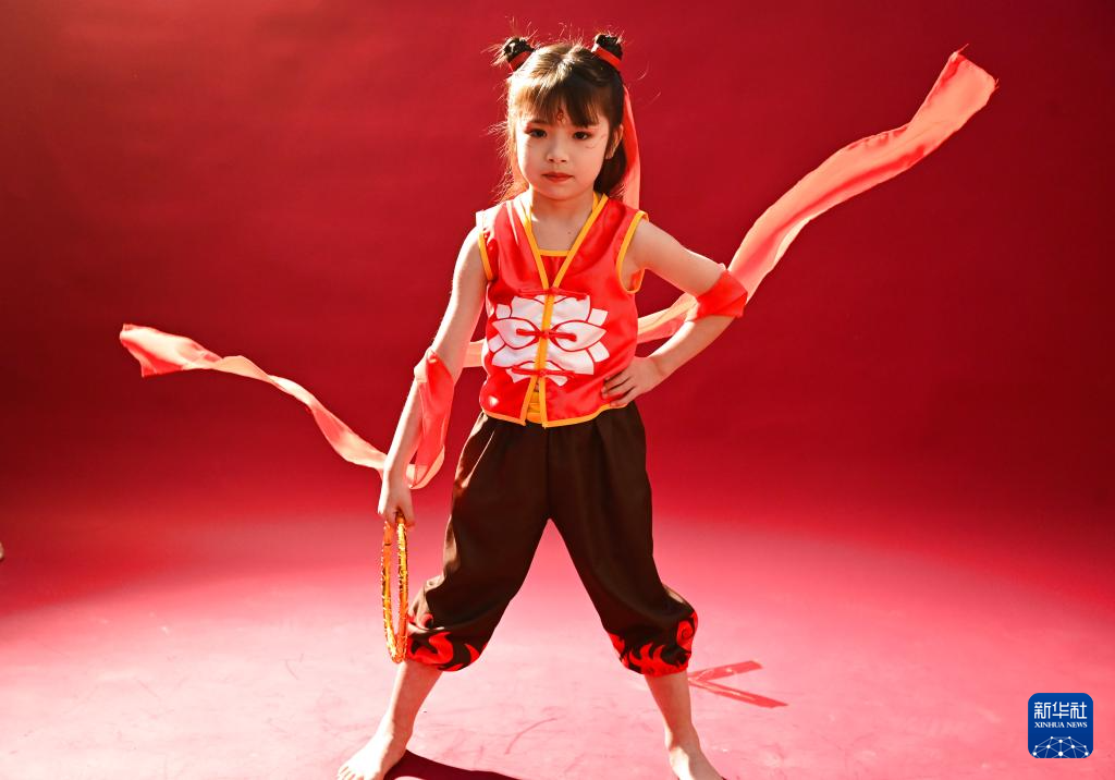 2月22日,小朋友在山東省聊城市的一家兒童影像館拍攝哪吒主題寫真。