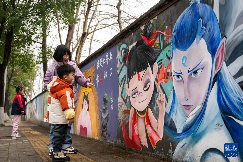 2月23日,市民在長沙市岳麓區岳麓街道五星村觀看哪吒主題墻繪。