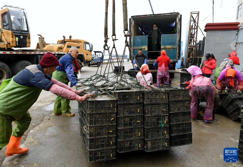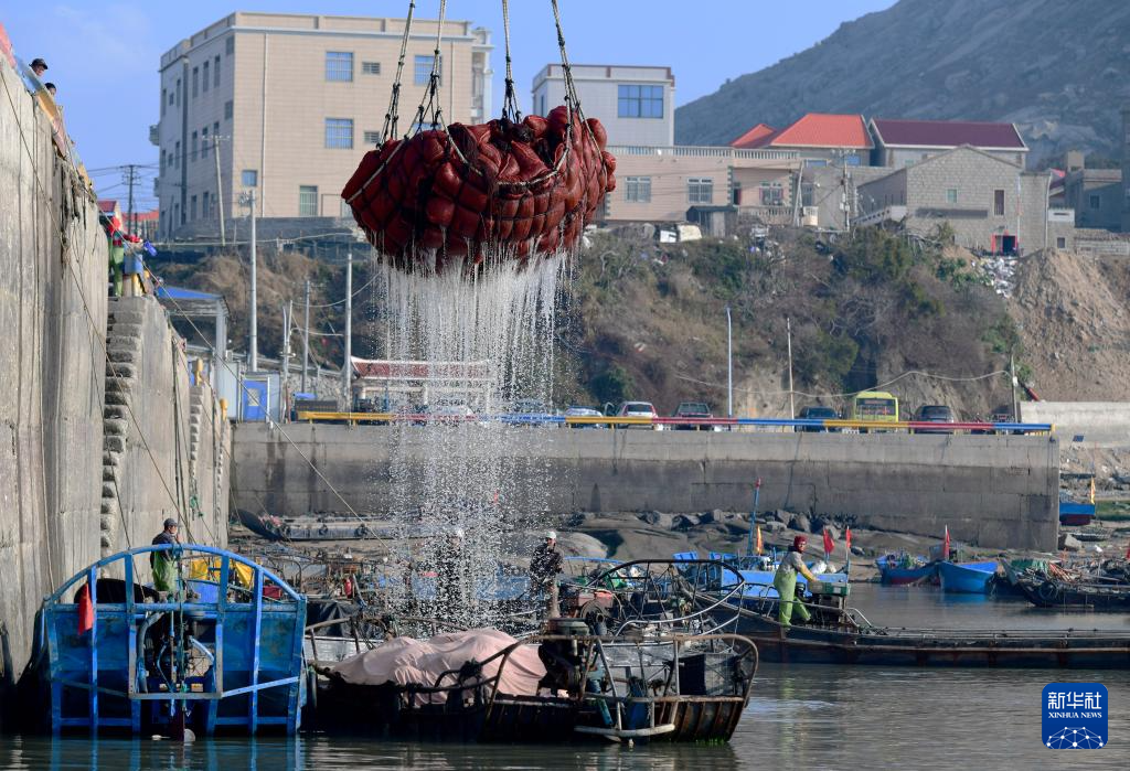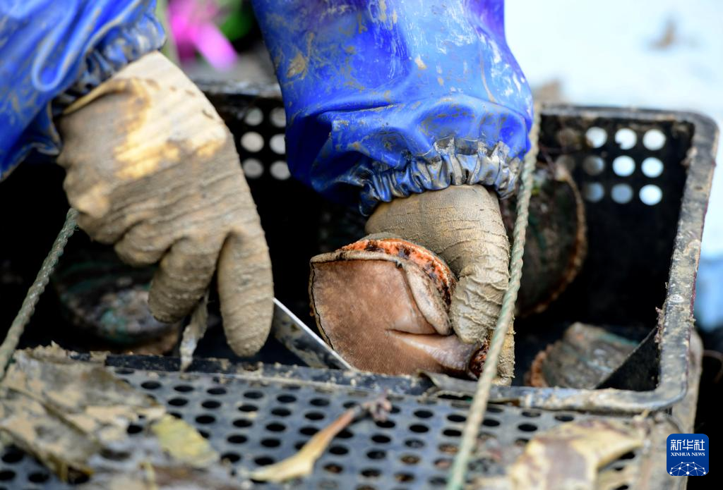 在莆田南日島海域碼頭,漁民剛收獲上岸大規格鮑魚,為春耕布網放苗做準備(2月27日攝)。