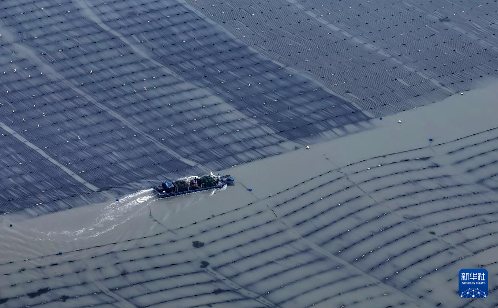 一艘海上養殖作業船穿行在莆田南日島海域的龍須菜養殖區(無人機照片,2月27日攝)。