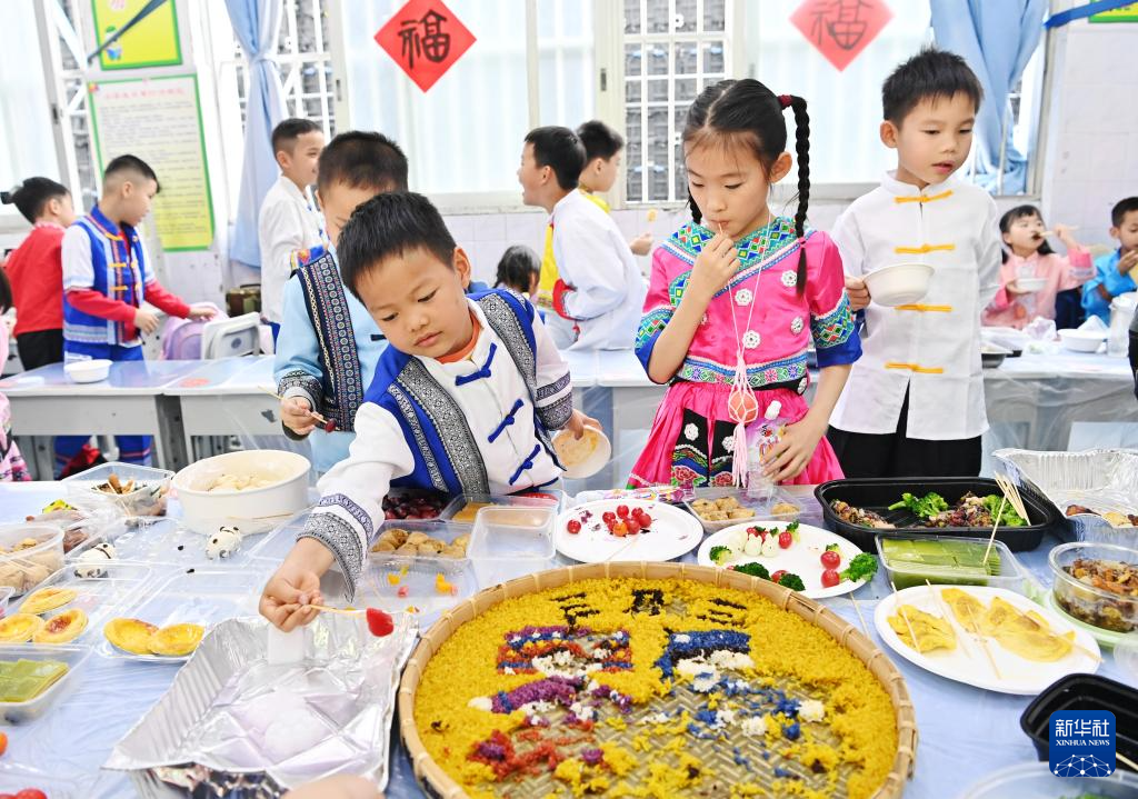 3月27日,孩子們在廣西南寧市民族大道東段小學品嘗傳統美食。